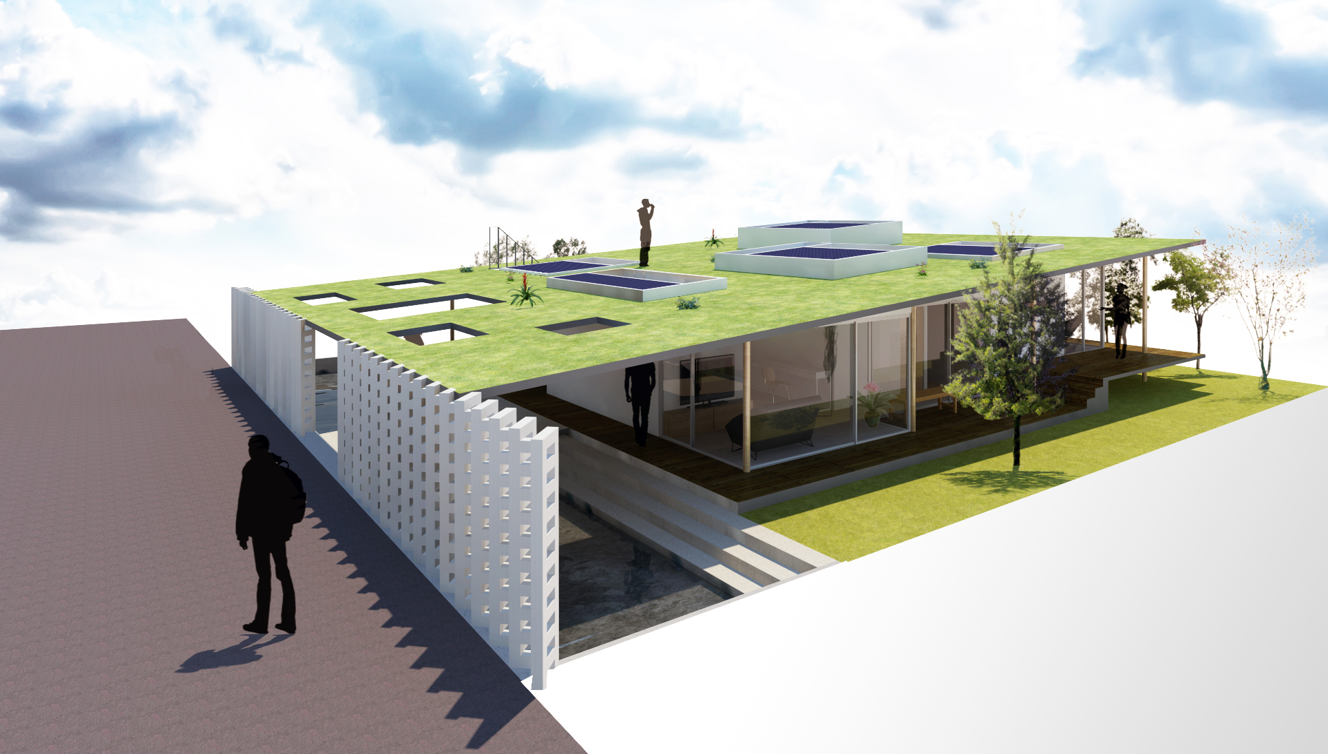 「個の空間」は断熱・防音・空調をしっかり備えたコクーン。屋上に隠した室外機や、視線は遮り風を通すブロックが、静けさと通風を両立します。キッチンもあえて個室化し、ガラスの外皮に囲まれたオープンスペースに不要なヒエラルキーを生まない構成に。冬は集熱パネルの熱を活かした床暖房が家全体をやわらかく温め、夏は水盤の気化熱と上昇気流、屋上緑化が涼やかな流れをつくります。家具の置き方次第で、スタディ、くつろぎ、ダイニングが滑らかに切り替わる自由度も魅力です。